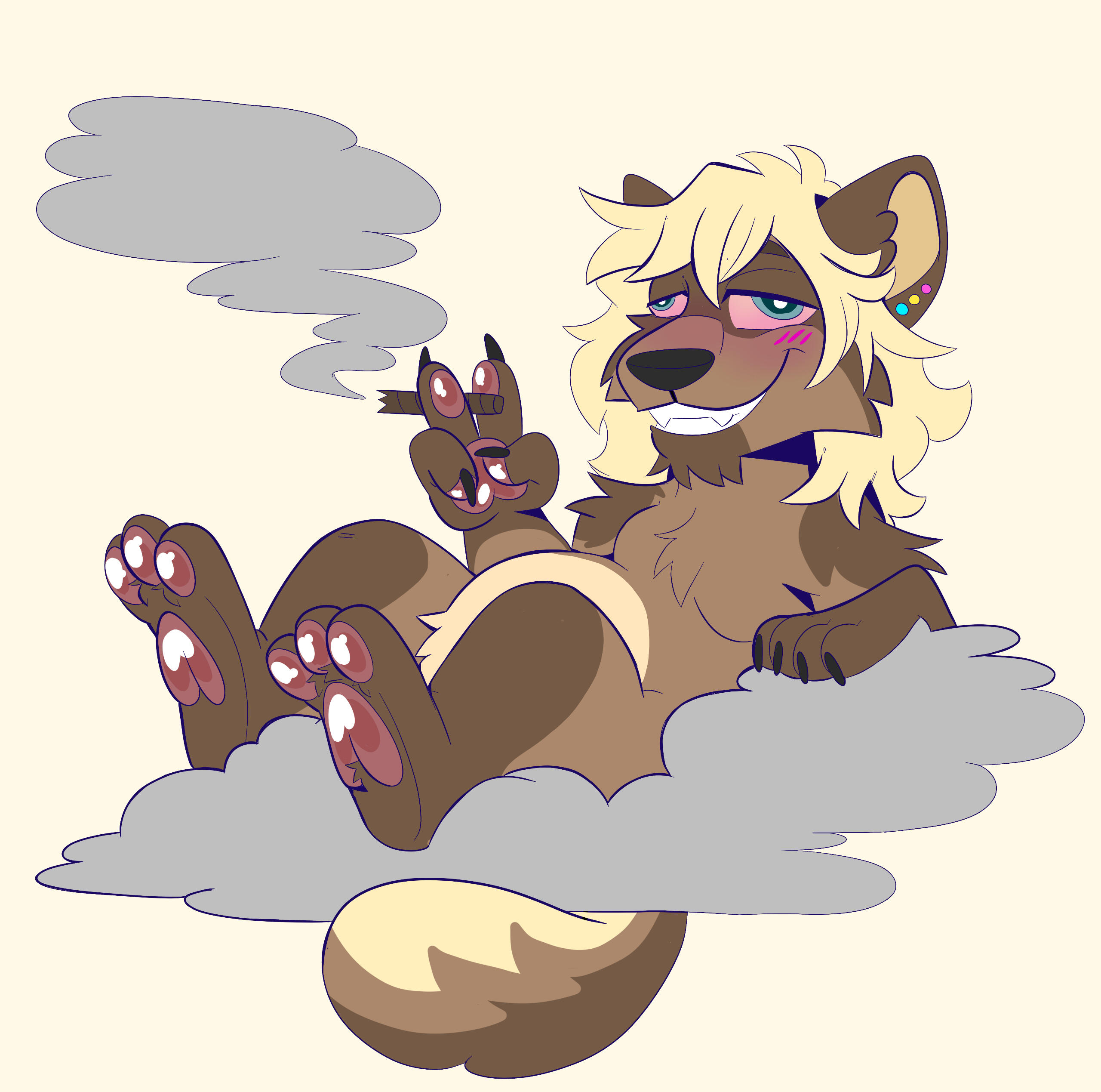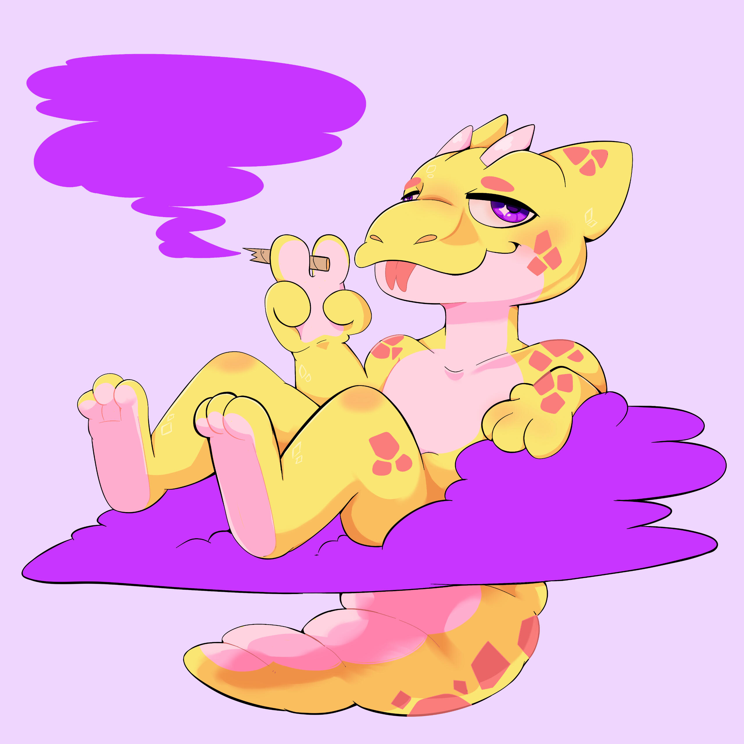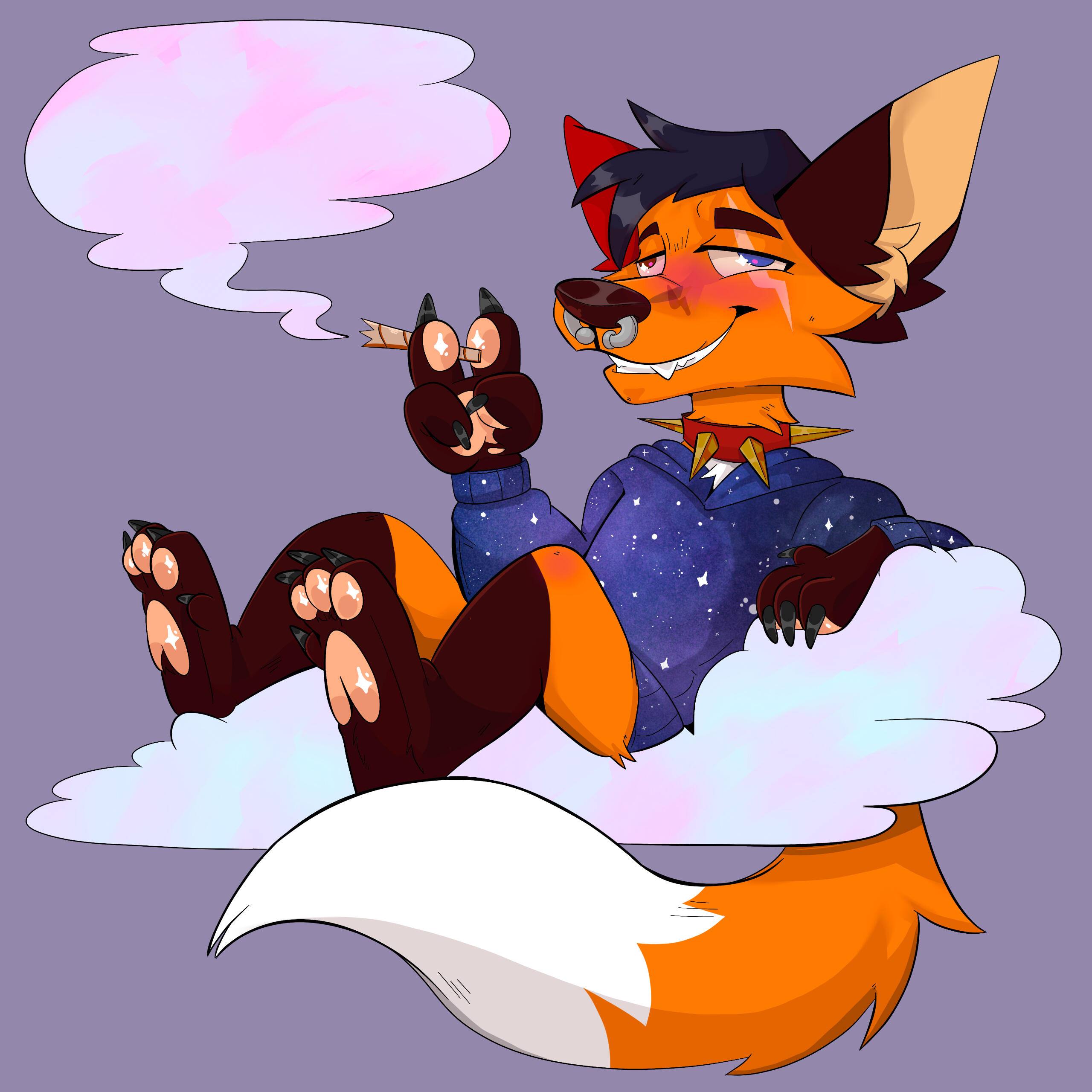 A fullbody drawing of a character of your choice smoking a joint/vape on a cloud.